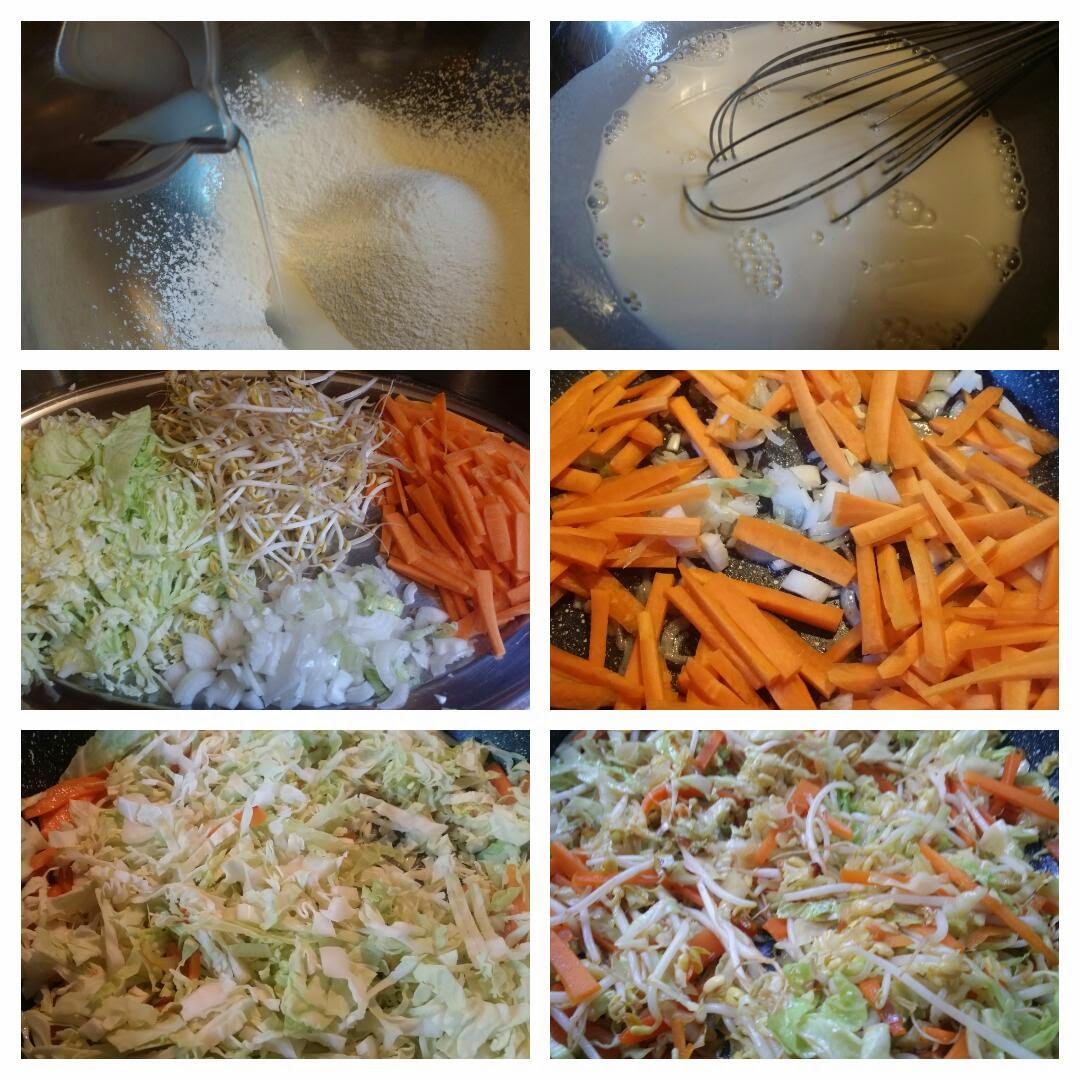 Tagliare a bastoncini sottili le carote,tagliare a fettine le cipolle e il cavolo.Soffriggere in olio le carote con cipolle per 5 minuti,poi aggiungere il cavolo e cuocere per altri 3 minuti,infine aggiunge i germogli,scottare per 1 minuto ,condire con salsa di soia e spegnere.